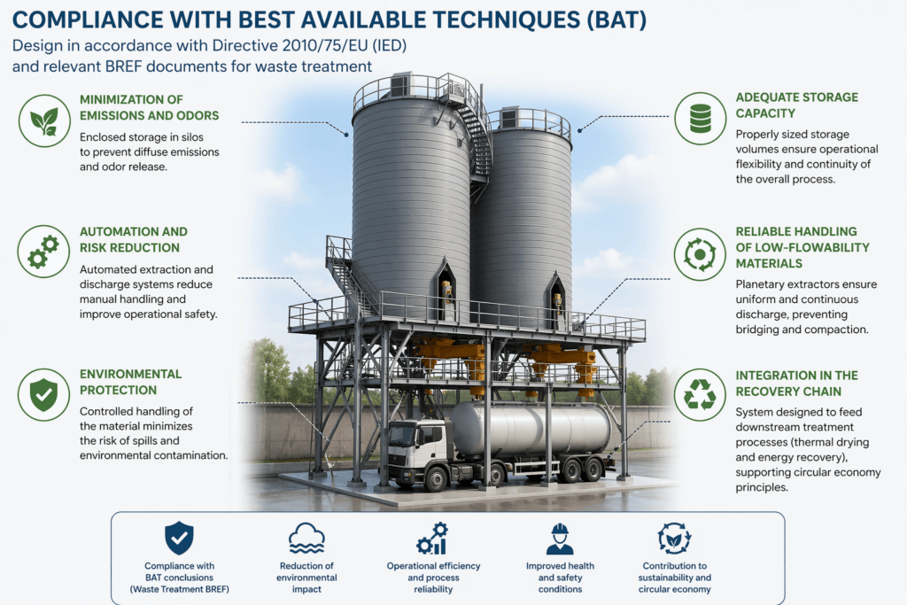 The system design has been developed in accordance with the principles of Best Available Techniques (BAT) as defined by Directive 2010/75/EU (Industrial Emissions Directive – IED) and relevant BREF documents for waste treatment.