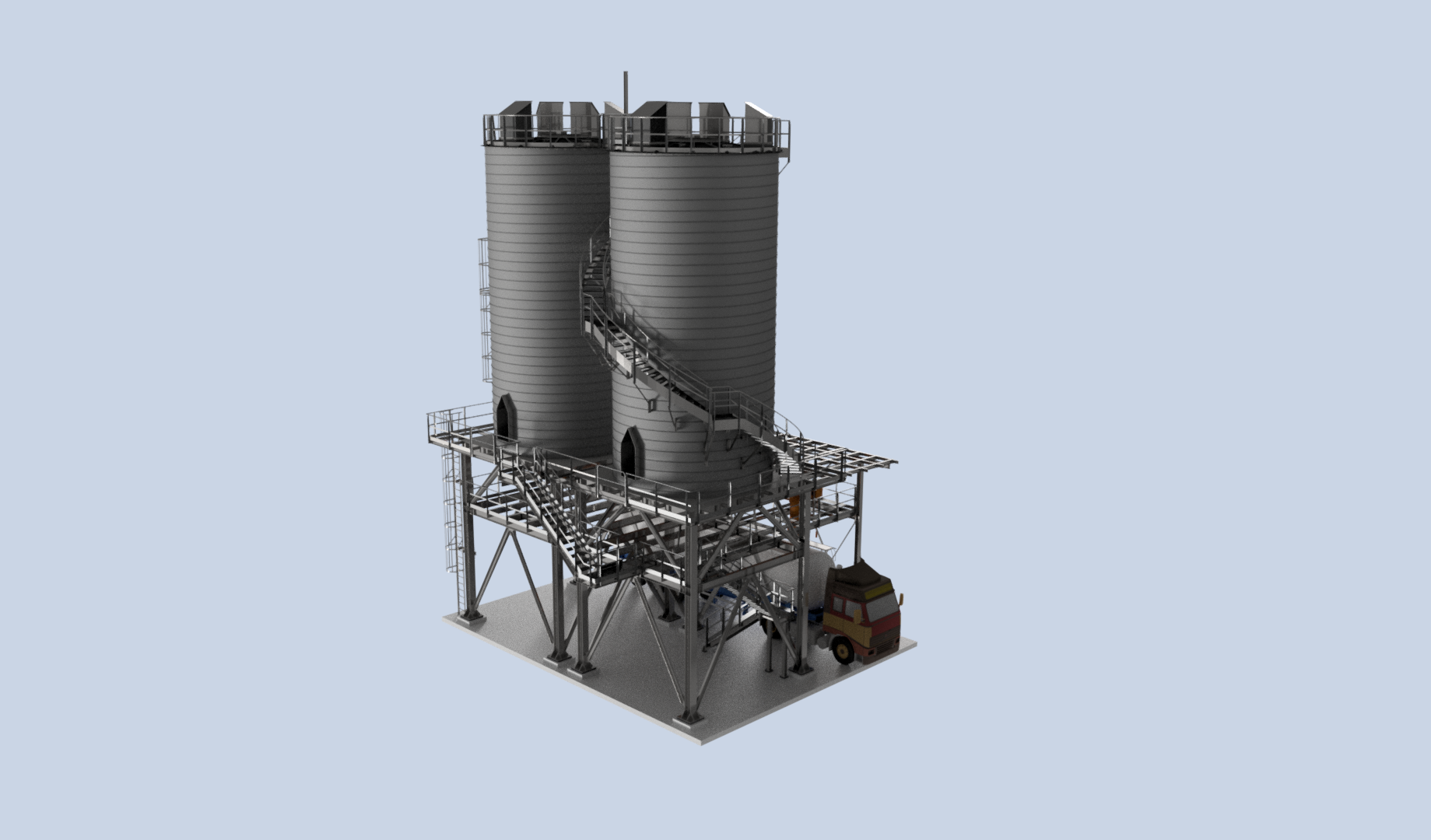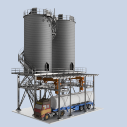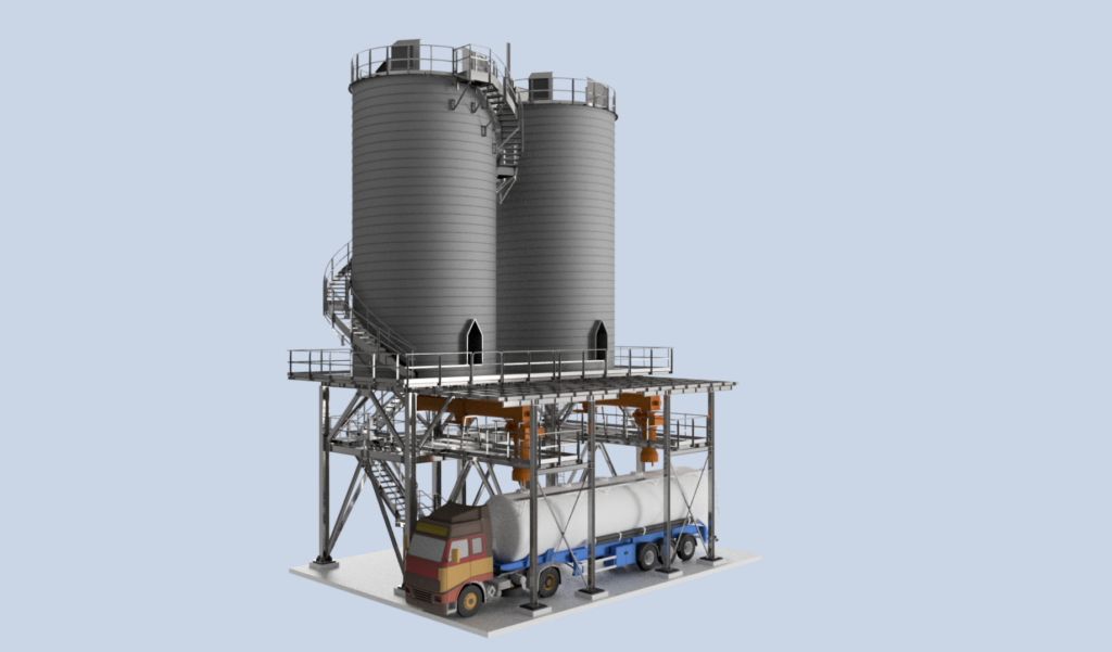 The system will be installed on an elevated steel structure, designed to allow direct truck loading. A dedicated loading area will be provided beneath the silos, where sludge will be transferred via extraction and conveying systems, optimizing logistics and reducing loading times.