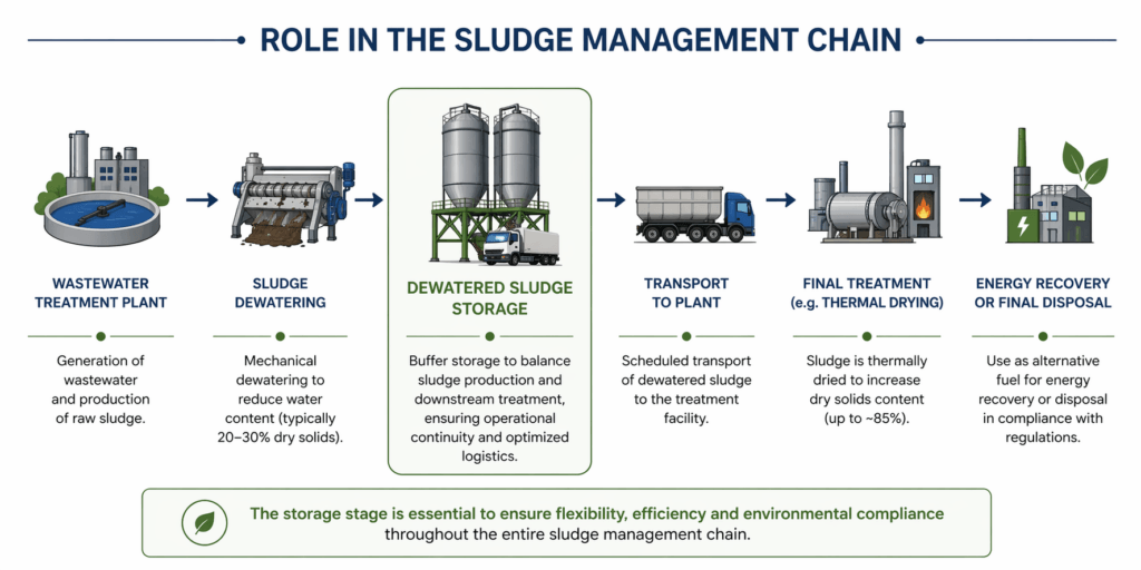 In this context, the storage system plays a strategic role as a buffer unit, ensuring operational continuity between sludge production and downstream treatment processes, regulating flow rates to the plant, and optimizing transportation and loading operations.