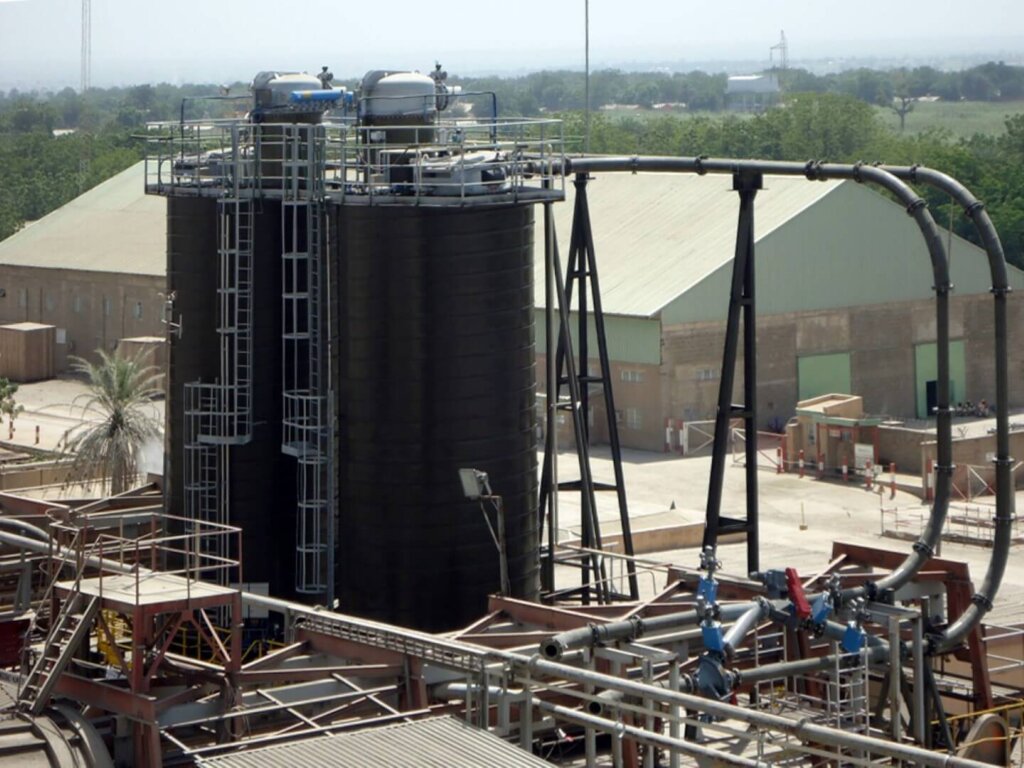 Posizione Nigeria PRODOTTO Lignite DATI -N°2 Silos cap. 150mc a tenuta di pressione 2bar -Tramogge coniche con rivestimento inox Tetto rinforzato a tenuta di pressione DETTAGLI IMPIANTO